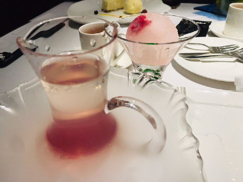 甜品胜在颜值,味道实际并不算惊艳,提拉米苏是可以现场制作。少女向选择可以是香颂玫瑰露,不甜,清香。我妈却说像肥皂水的味道hhh。法式芒果拿破仑有点偏甜了,配了一颗戏精树莓在旁边,“酸喊不要”毫不夸张。冰淇淋是淡淡的椰子口味。喜欢酸酸的胖友我推荐蛋白薄脆草莓青柠雪葩,里面的沙冰很解腻开胃,如果带小朋友来吃可以试试黑森林蛋糕,还有跳跳糖。